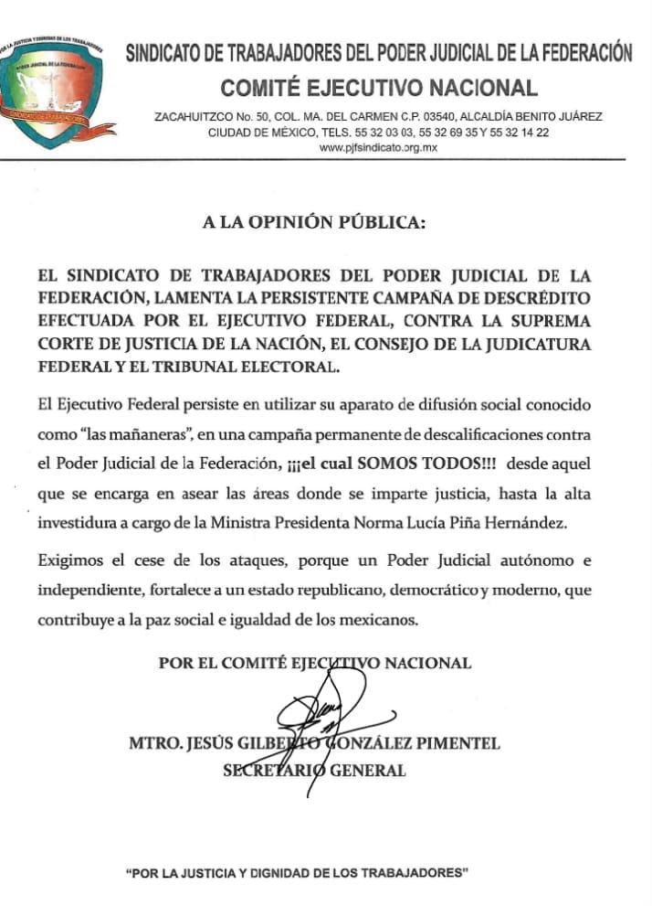 El Sindicato de Trabajadores del Poder Judicial de la Federación, citó en un comunicado, se suma de esta manera a la exigencia de Colegios y Barras de Abogados, Jueces, Magistrados, Ministros y trabajadores en general quienes se han pronunciado por frenar los señalamientos en contra de éste poder del Estado Mexicano, los cuales en nada abonan al diálogo, entendimiento y acuerdos que deben prevalecer entre los Tres Poderes de la Unión.