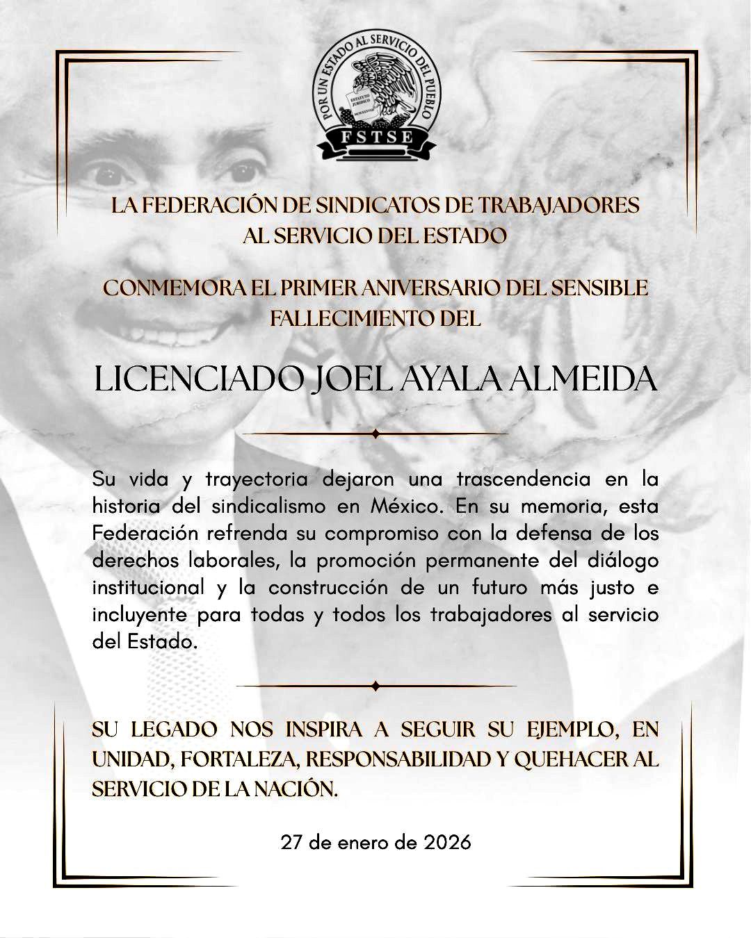 La Federación de Sindicatos de Trabajadores al Servicio del Estado conmemoró este 27 de enero 2026, el primer aniversario del sensible fallecimiento del Licenciado Joel Ayala Almeida, líder de esta central de trabajadores durante las últimas tres décadas.